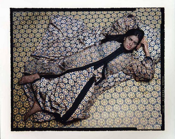 Moroccan-born, New York-based photographer Lalla Essaydi lures the viewer into her third solo show at Howard Yezerski Gallery with a pair of stunning large scale pictures hung in the front window. Each depicts an Arab woman covered in calligraphy and posed to imitate a famous nineteenth-century Orientalist painting. Fumee d'Ambre Gris , 2008, which features a young woman lifting her white veil to draw in the titular aphrodisiac, is based on Sargent's 1880 painting of the same name. The Grande Odalisque, 2008, in parodying Ingres's famous painting of a nude girl languishing in a Turkish harem, also critiques Western exploitation of Eastern women. In her contemporary version, Essaydi rejects the distorted, dreamy, and nude portrayal found in Ingres's "gentleman's" painting, instead creating a realistic, clothed figure: a strongwilled woman who challenges the viewer to respect her and her domestic setting. Born and raised in Morocco, where only men are allowed to practice calligraphy, Essaydi rebelliously inscribes her female subjects with Arabic script, taking photographs that, showing flesh, burkas, and backgrounds completely covered in henna, comment on female identity and on the restrictions suffered by many Arab women.